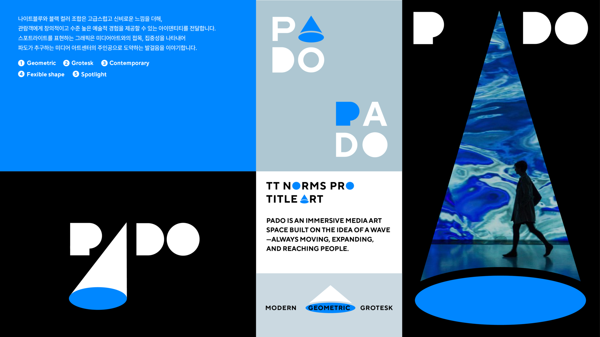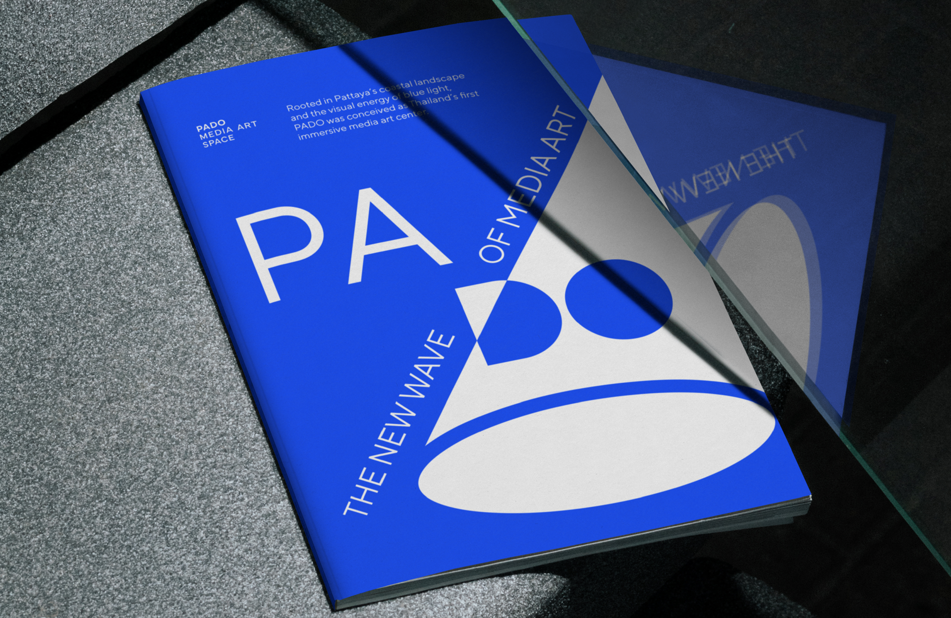 따라 유연하게 확장된다. 블루와 블랙의 대비는 공간의 긴장감을 절제되게 유지하며, 관객의 시선을 콘텐츠와 경험에 집중시킨다. PADO는 하나의 로고를 넘어, 태국 전역으로 확장 가능한 미디어 아트 플랫폼의 아이콘으로 기능한다. 파도는 멈추지 않고, 브랜드 역시 고정되지 않는다.
