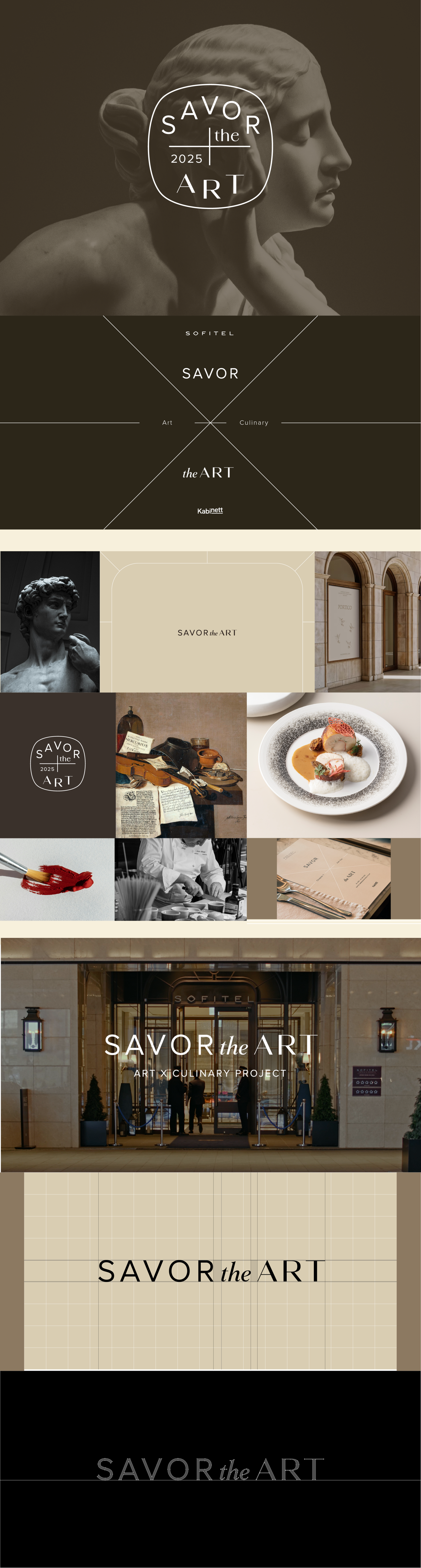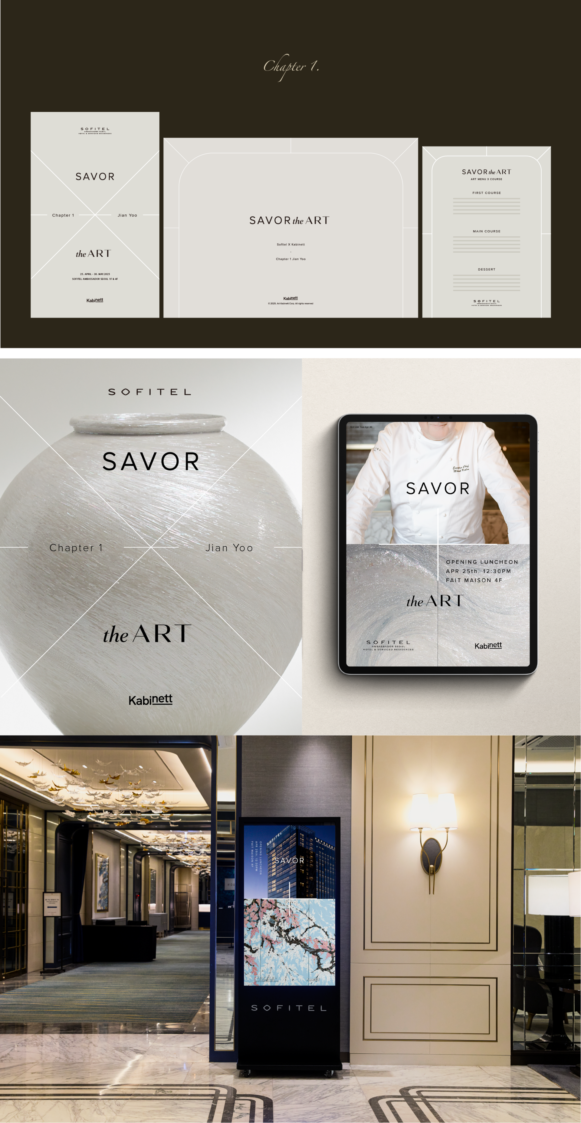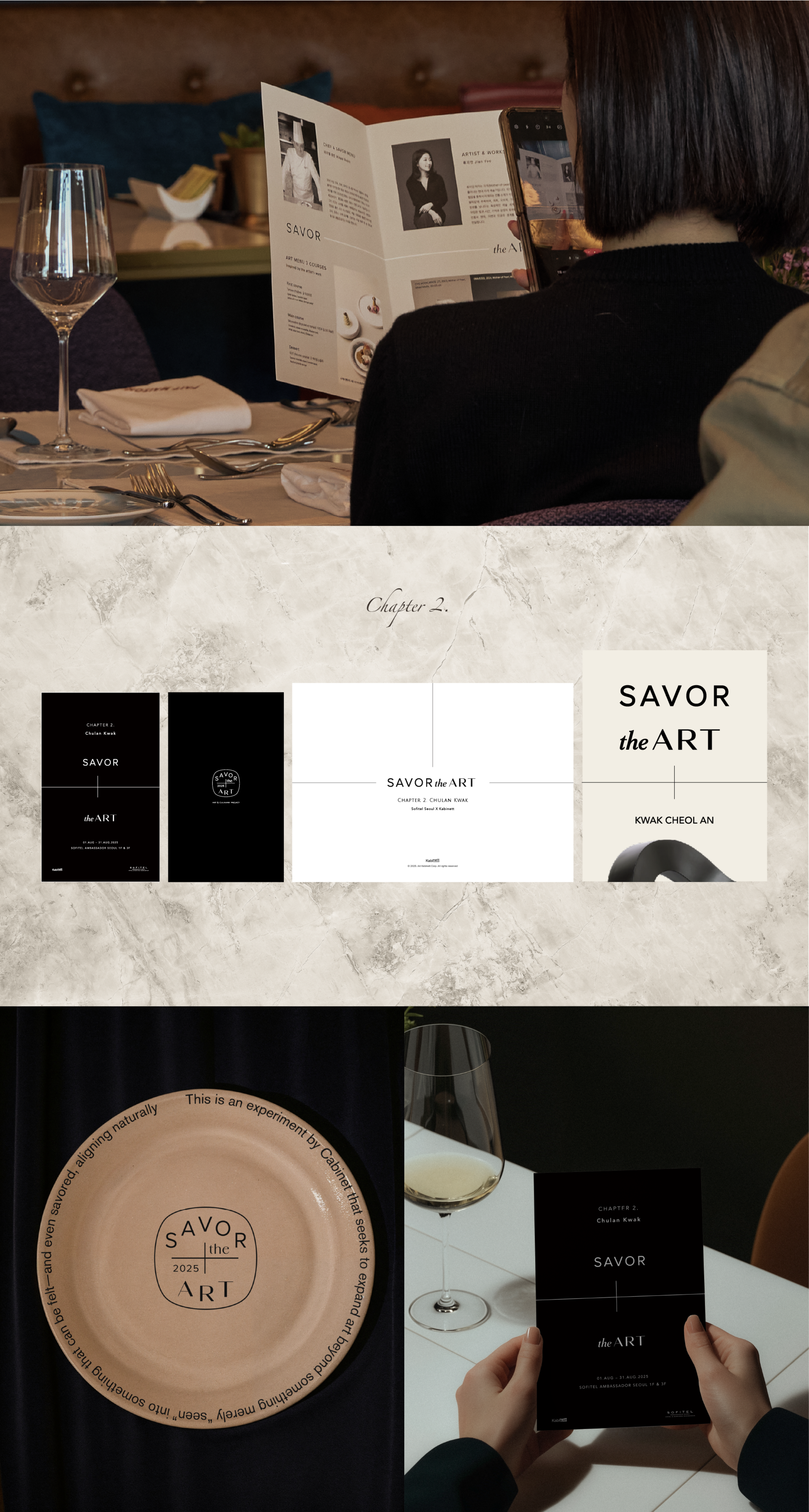 SAVOR the ART is an art and culinary project co-organized by Sofitel Ambassador Seoul and the contemporary art platform Kabinett.This multidisciplinary exhibition presents a harmonious intersection between the mother-of-pearl artworks of artist Jian Yoo and modern French cuisine. Designed to offer a sensorial experience that transcends the boundaries between sight and taste, space and perception, the project’s visual identity draws inspiration from the symbols “+” and “×” to express the fusion of art and gastronomy.From the leaflet and menu design to the event identity system, a cohesive brand experience was developed across all touchpoints.